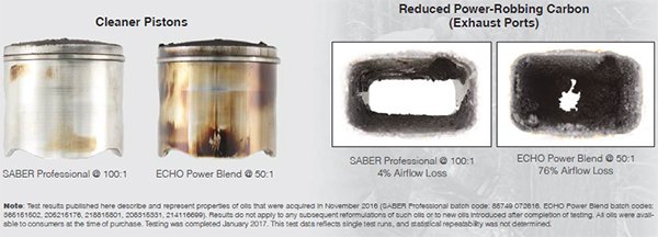 Τα συνθετικά βασικά έλαια του SABER Professional καίγονται πιο καθαρά από άλλα συνθετικά και συμβατικά βασικά έλαια. Εξαλείφει τις εναποθέσεις άνθρακα που οδηγούν σε κολλημένους δακτυλίους εμβόλων και φραγμένες θύρες εξάτμισης. Μετά από 300 ώρες δοκιμής επαγγελματικής χρήσης σε αλυσοπρίονα ECHO, το SABER Professional, αναμεμειγμένο σε 100: 1, αντιστέκονταν στον άνθρακα καλύτερα απ 'ότι το ECHO Power Blend * XTended Life * Universal Oil 2-Stroke αναμιγμένο με 50: 1. Για πλήρη αποτελέσματα δοκιμών, ανατρέξτε στην Τεχνική Μελέτη ECHO 100: 1 Trimmer String (G3470).