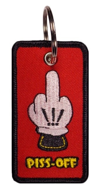 Μπρελόκ υφασμάτινο με κεντητό λογότυπο PISS OFF και στις δύο όψεις.
