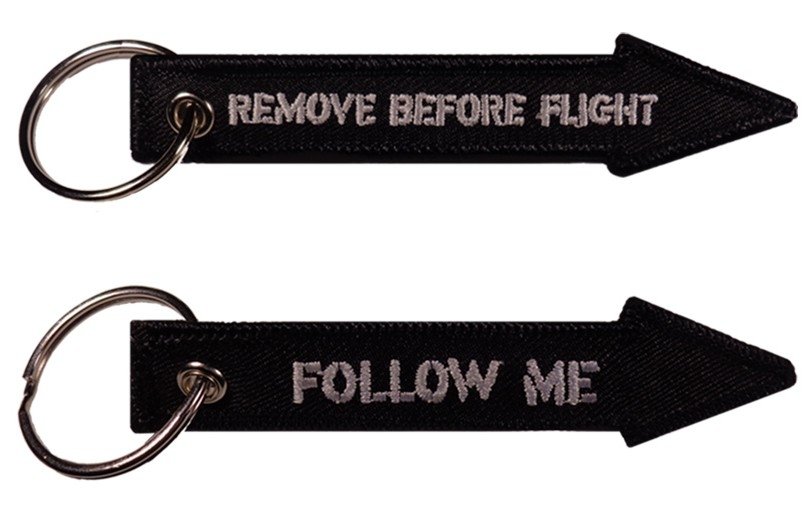 Μπρελόκ υφασμάτινο με κεντητό λογότυπο REMOVE BEFORE FLIGHT στη μία όψη και FOLLOW ME στην άλλη.