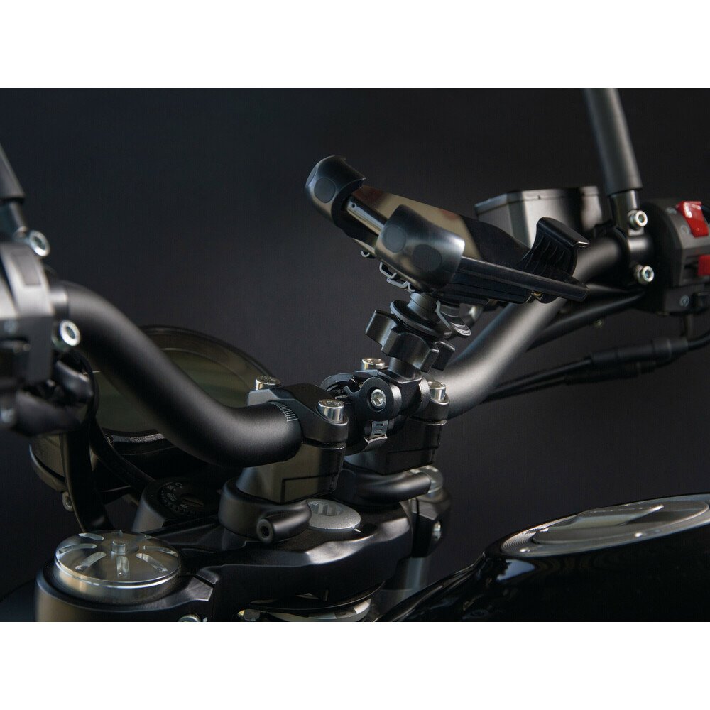 Βάση στήριξης κινητού Clamp από την σειρά Titan Optiline της εταιρίας Lampa, ιταλικής προέλευσης, κατασκευασμένη από υψηλής ποιότητας χυτοπρεσαριστό ατσάλι πάχους 15 mm σε μαύρο χρώμα, η οποία μπορεί να συνδυαστεί με όλες τις θήκες ή αντάπτορες κινητού της σειράς Optiline. Η βάση στήριξης είναι universal εφαρμογής και τοποθετείται στο τιμόνι της μηχανής ή του ποδηλάτου, καθώς και σε οποιονδήποτε στρογγυλό σωλήνα με διάμετρο από 14 mm έως 34 mm. Διαθέτει ρυθμιζόμενο λαιμό για καλύτερη γωνία κλίσης, μεταλλικό, ρυθμιζόμενο σφιγκτήρα τοποθέτησης και επένδυση από EPDM λάστιχο στο σημείο επαφής του βραχίονα με τον σκελετό του οχήματος για προστασία από τριβή, εκδορές, γρατζουνιές, κ.ο.κ. κατά την εφαρμογή της. Ιδανικό προϊόν για να μπορείτε να μεταφέρετε με ασφάλεια το smartphone σας με την μηχανή ή το ποδήλατό σας σε κάθε προορισμό. Κατάλληλη για να στηρίζει την συσκευή σας, ώστε να μπορείτε να κάνετε χρήση του gps, να λαμβάνετε κλήσεις και να έχετε άμεση πρόσβαση στο κινητό σας κατά την διαδρομή! Απολαύστε το ταξίδι σας ή την καθημερινή διαδρομή μέσα στην πόλη με άνεση και εργονομία!